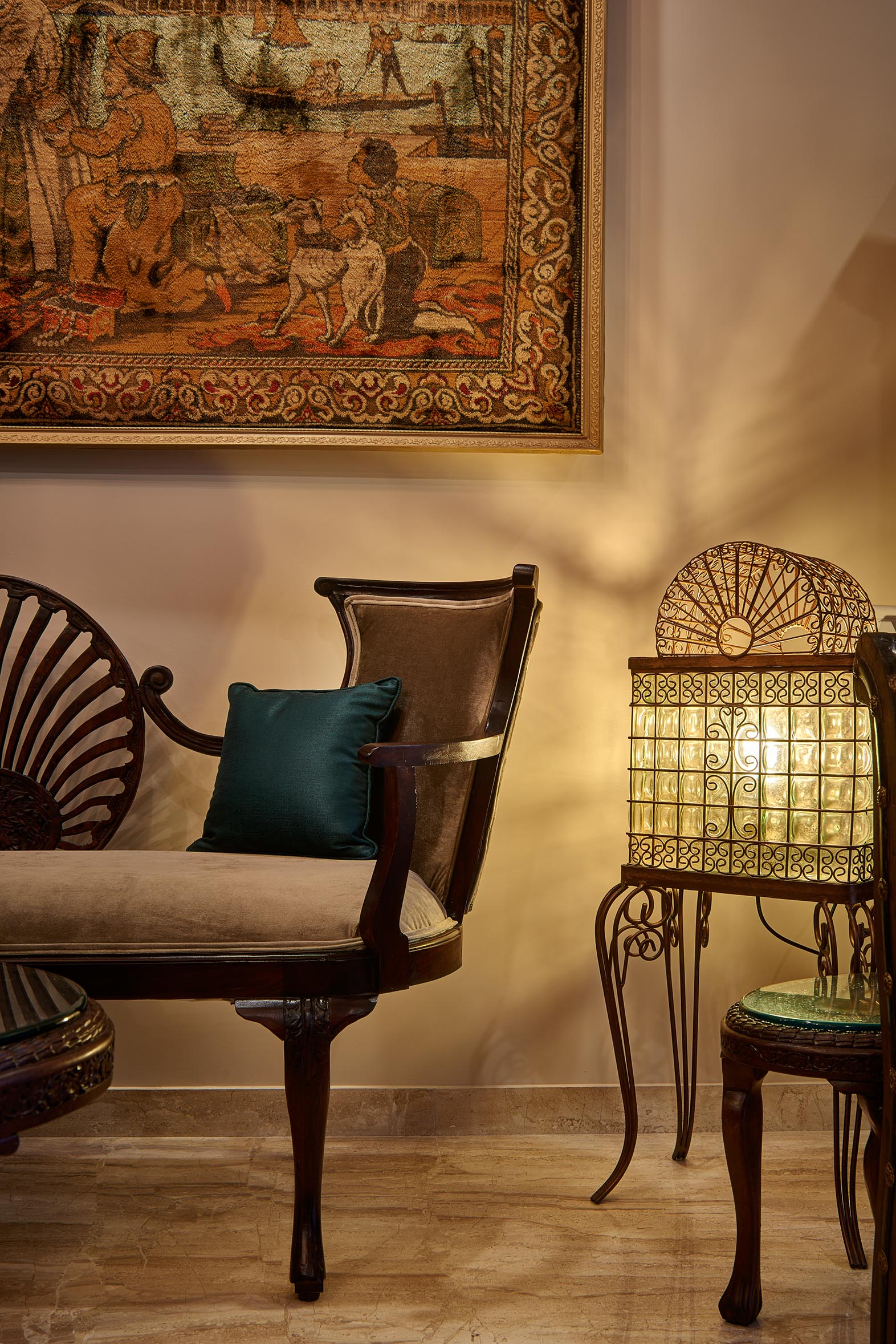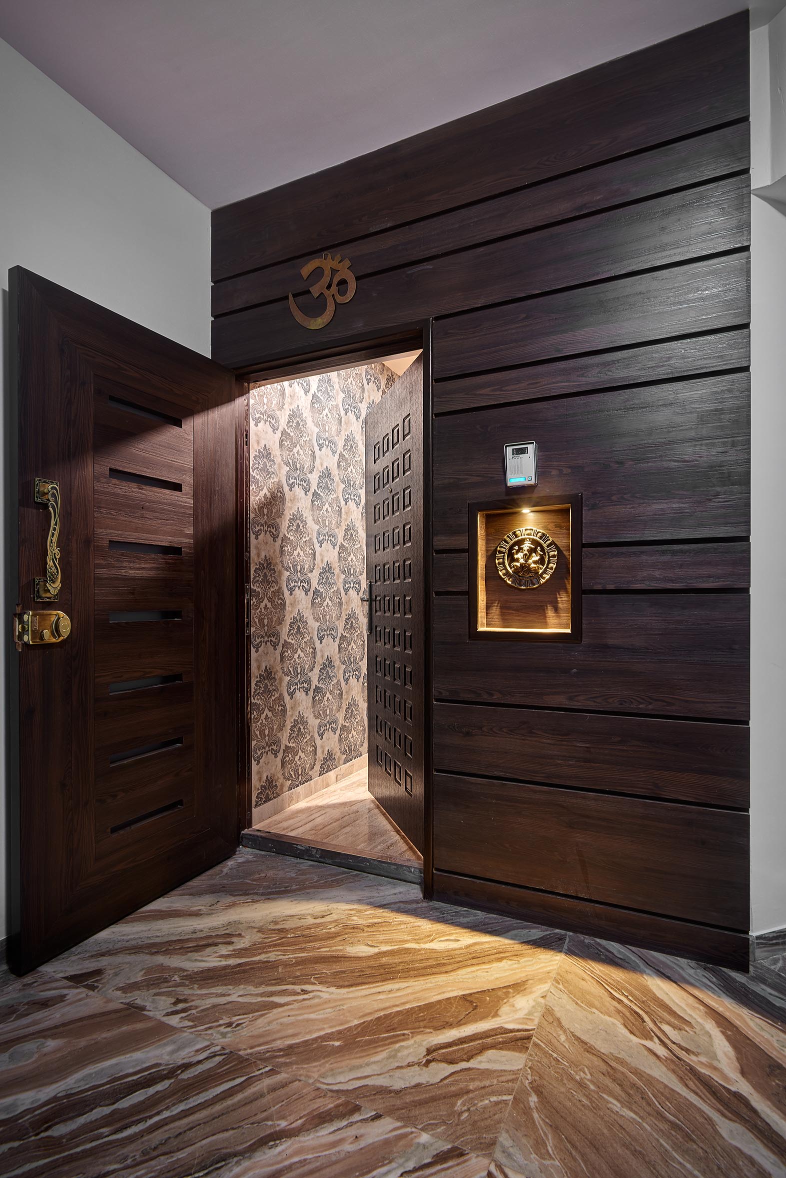 This apartment located in Baner has elegantly carved dark wood furniture, moldings, motif and floral wallpapers which speak of formal Victorian finishes and mark dramatic impressions! The lamp shades and cut glass work chandeliers provide beautiful lighting effects while a fawn color gives a subtle tone to the interiors.