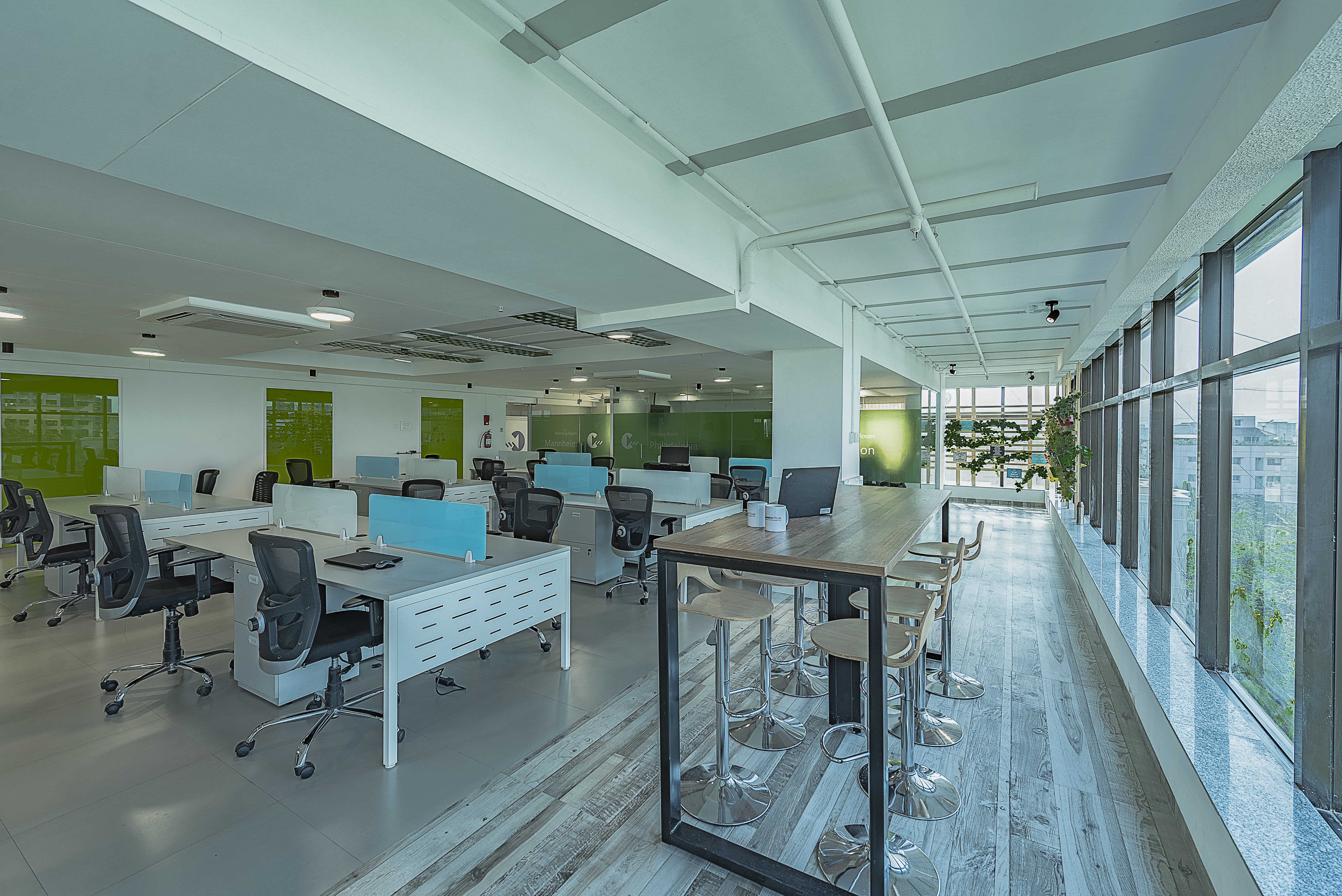 splash of blues and greens made this space interesting along with staying true to its corporate
