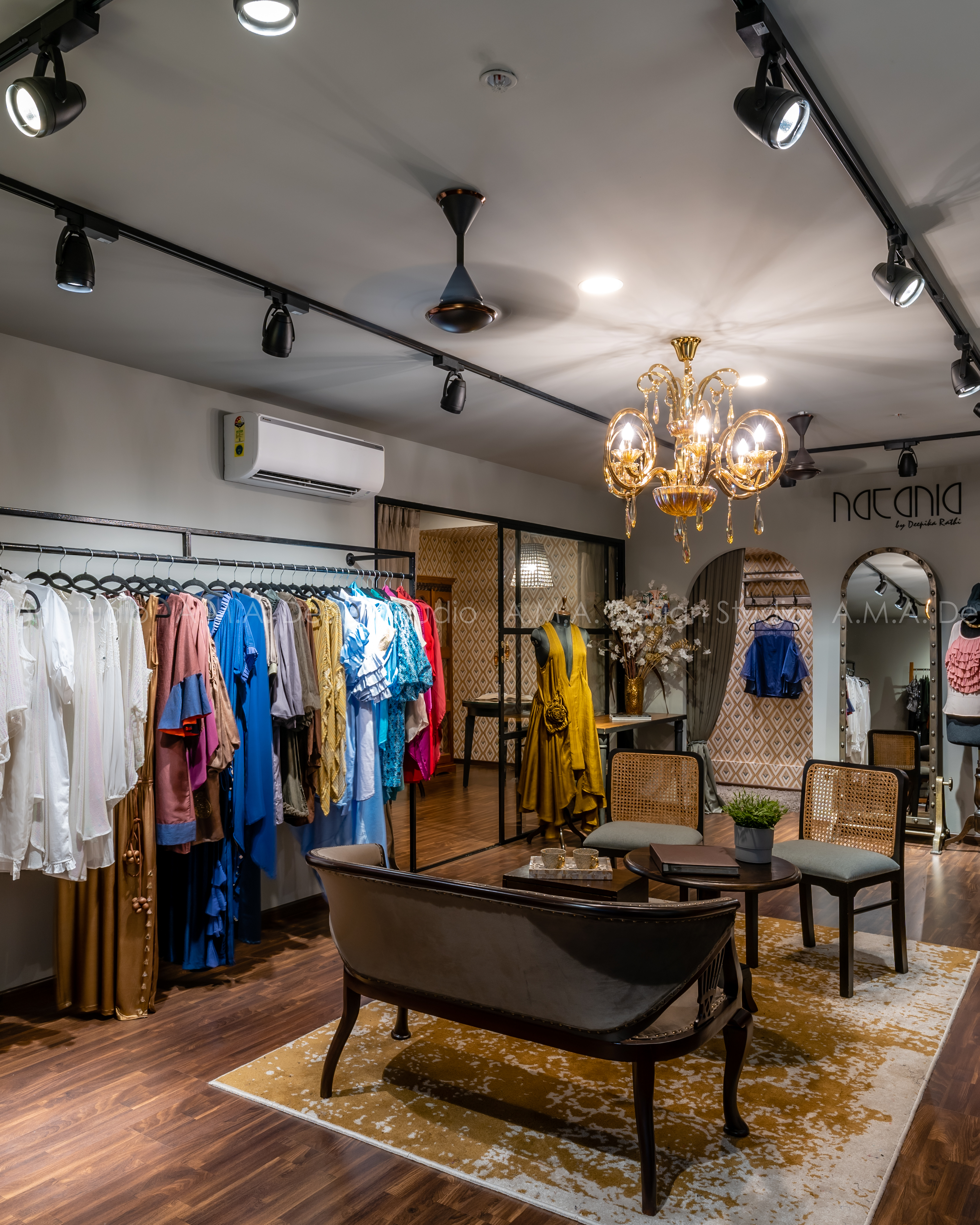 Natania by Deepika Rathi is a 750 sq.ft. boutique studio located in Aundh, Pune, completed in 2021. Drawing inspiration from New York City's iconic lofts, the studio fuses eclectic, vintage, and industrial elements to create a chic, edgy atmosphere. The design features gunmetal accents, dark earthy tones, wooden flooring, and eclectic furniture, reflecting the client's affinity for urban elegance. To address the challenge of low ceilings, the AMA design team employed a clever strategy by painting the walls and ceilings in the same color, creating the illusion of uninterrupted space and preserving the loft's essence.