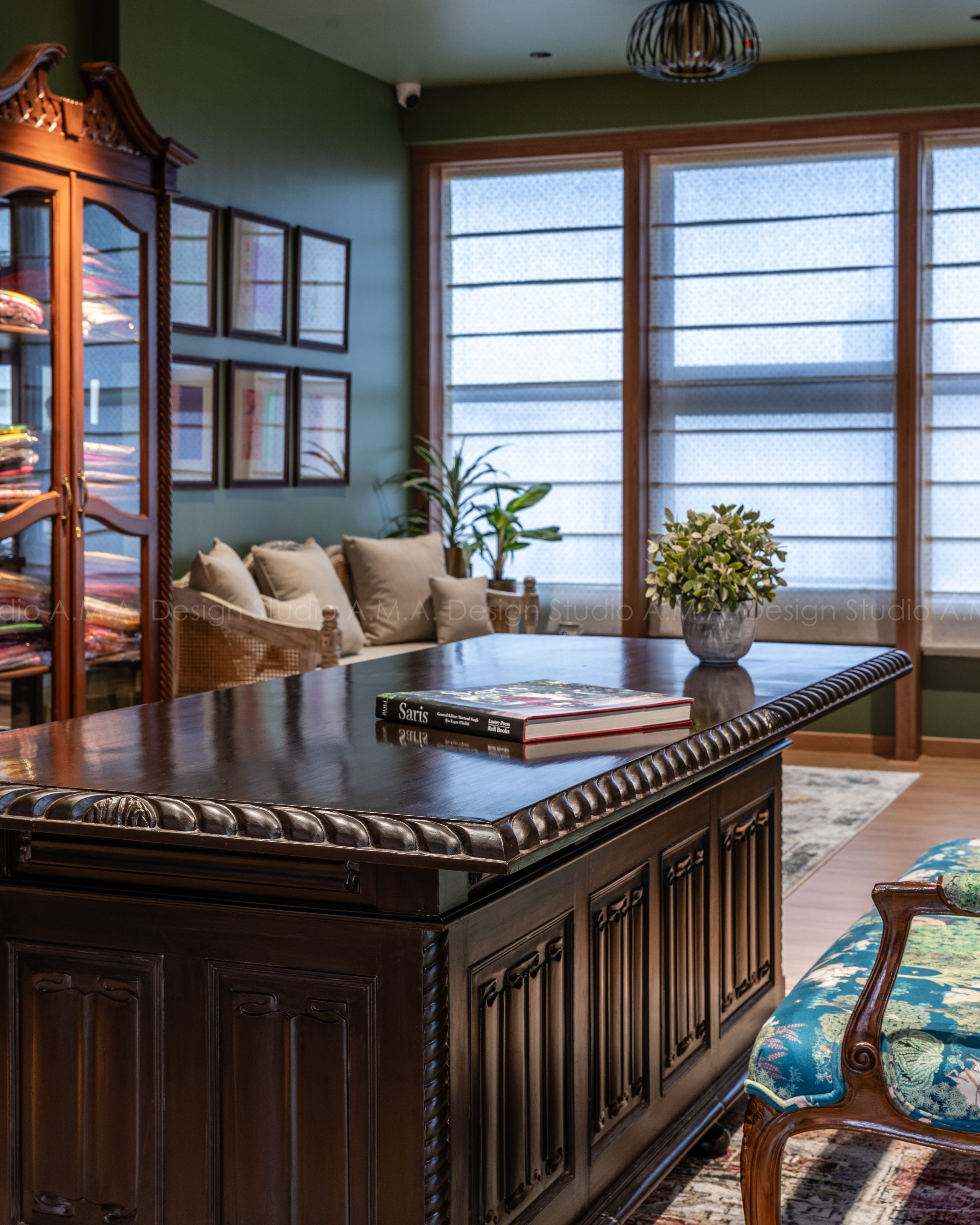 The boutique’s interior is dominated by a rich green palette, a choice made with meticulous care to highlight the inherent beauty of the textiles. This sophisticated hue not only complements the exquisite Pathani sarees but also imbues the space with a soothing and refined ambiance, setting the tone for a serene experience.