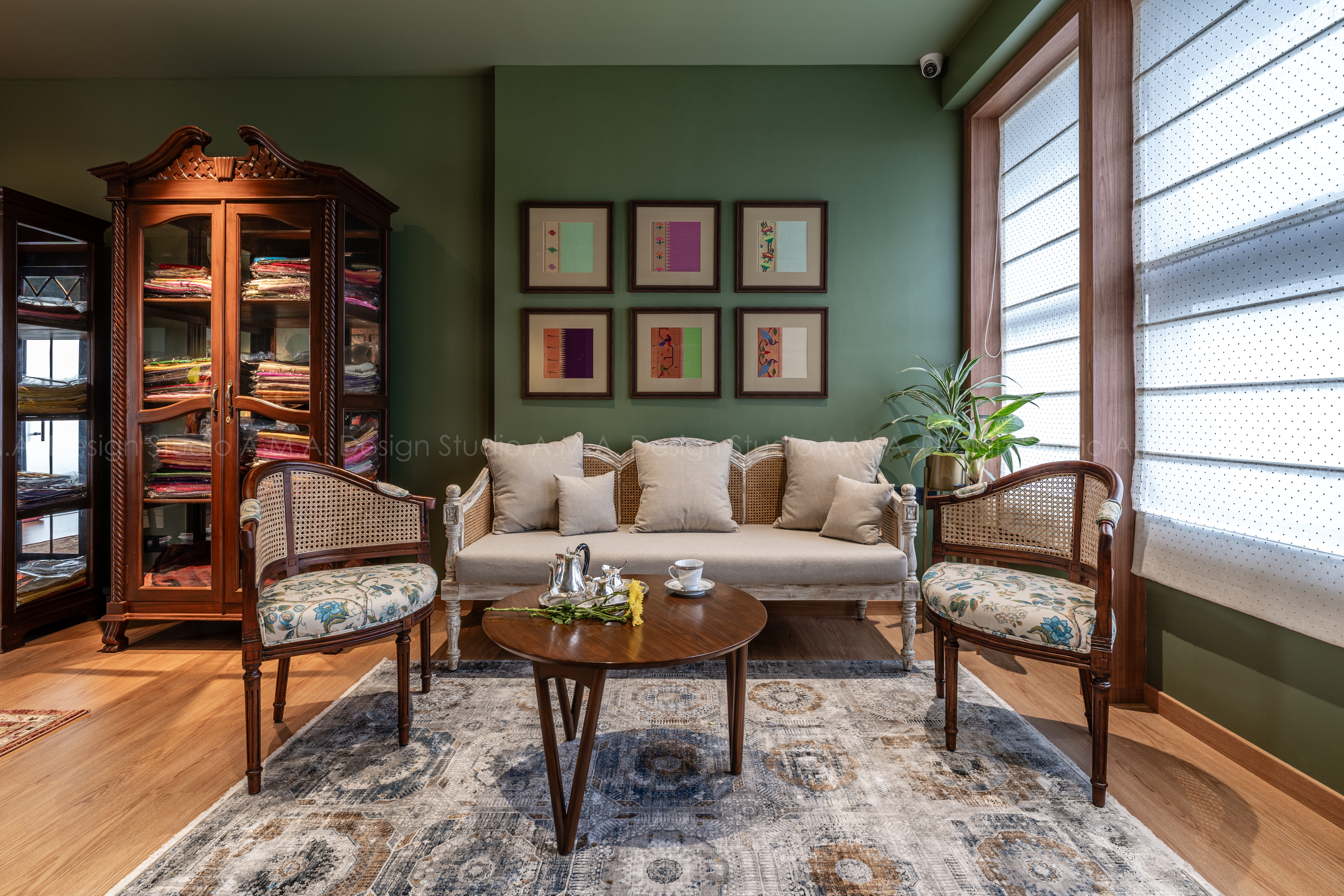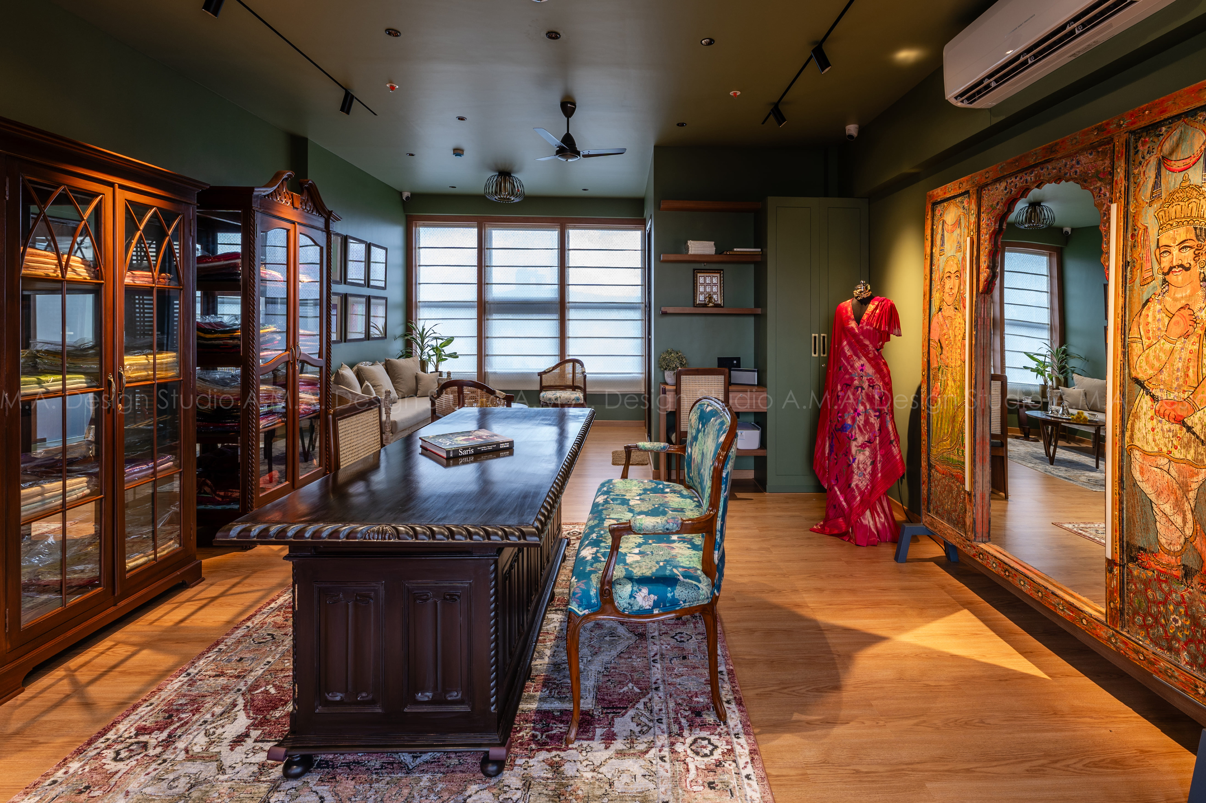 Located in the cultural heart of Pune, this 750 sq.ft. Paithani Saree Boutique—designed by Ar. Ajanta Mujgule — celebrates the enduring elegance of Maharashtrian heritage through a contemporary lens. Cloaked in a rich green palette that enhances the vibrancy of traditional Paithani sarees, the space strikes a balance between nostalgia and modernity. A vintage central table, bespoke wooden cabinetry, and transitional accents such as layered carpets and natural textures create an immersive experience that is both grounded and graceful. Designed to feel intimate yet timeless, the boutique reflects a thoughtful narrative where craft, culture and contemporary aesthetics converge.