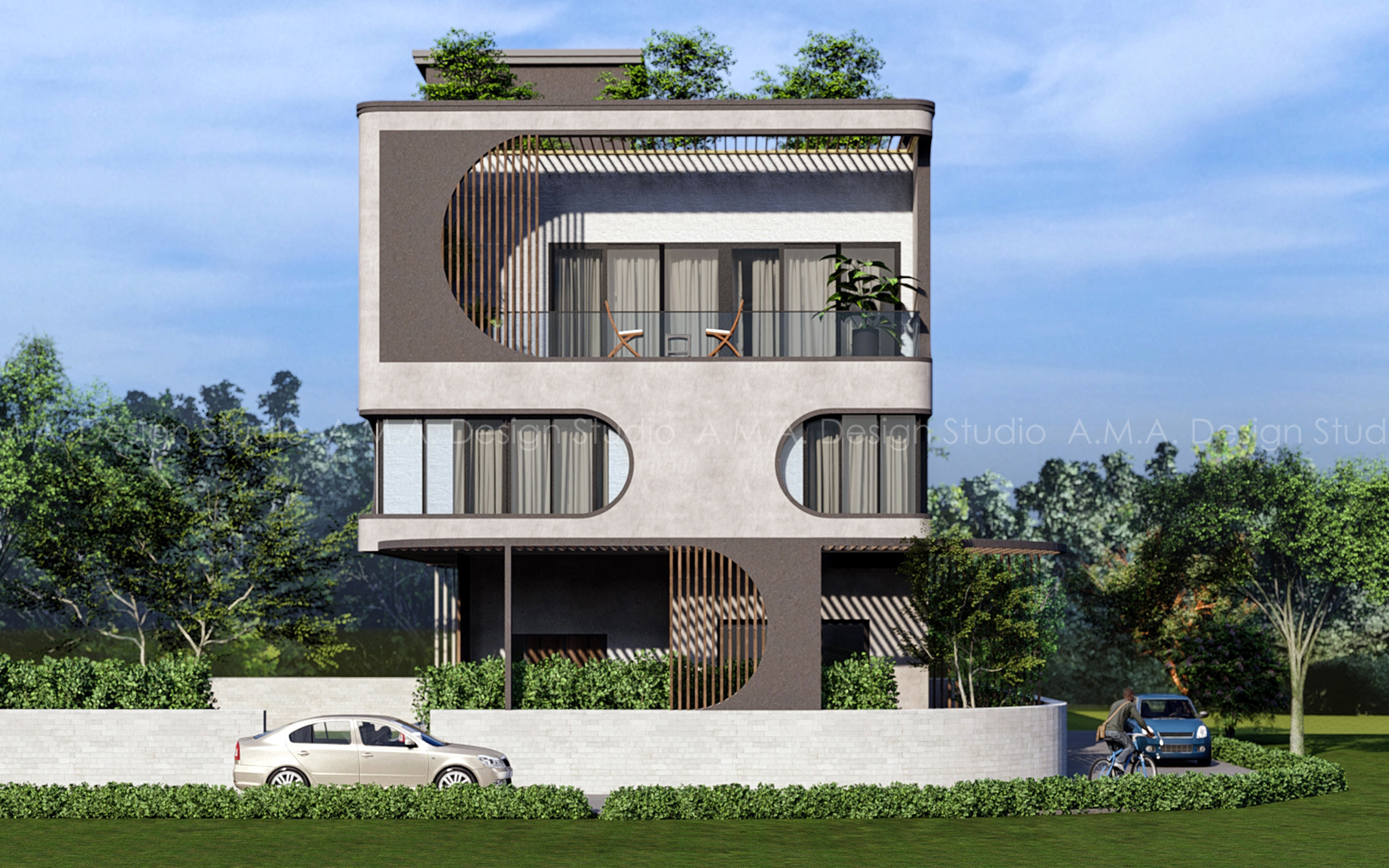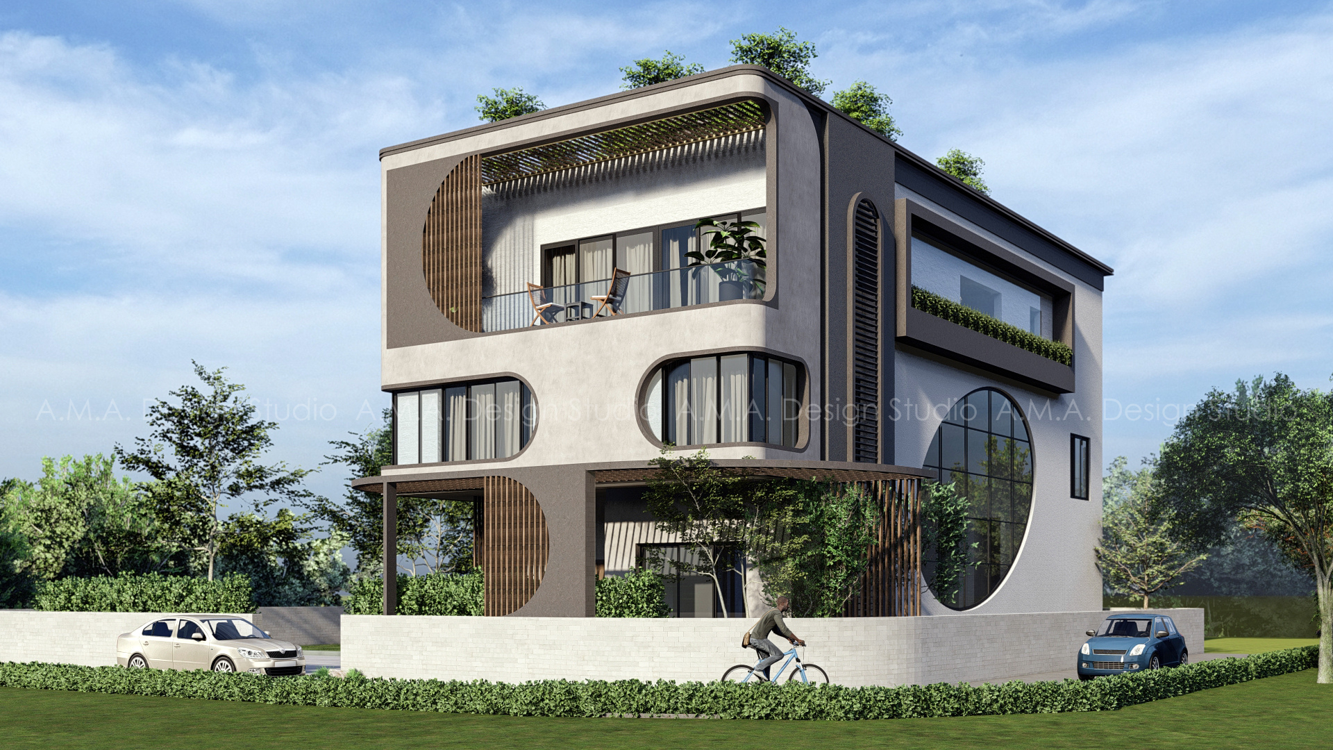 ‘Vrindavan’ is an 8,000 sq.ft. modern farmhouse set in the scenic hills of Karjat, designed as a luxurious yet peaceful retreat. The architecture features a bold blend of circular and rectangular forms, with open, flowing volumes that frame stunning views. Spread across three levels, the home is tailored for large family gatherings, with multiple living areas and intimate nooks that offer quiet moments of escape.