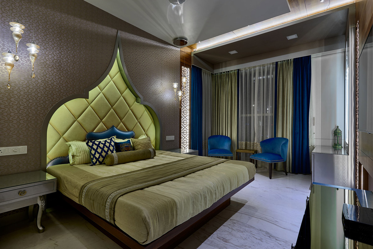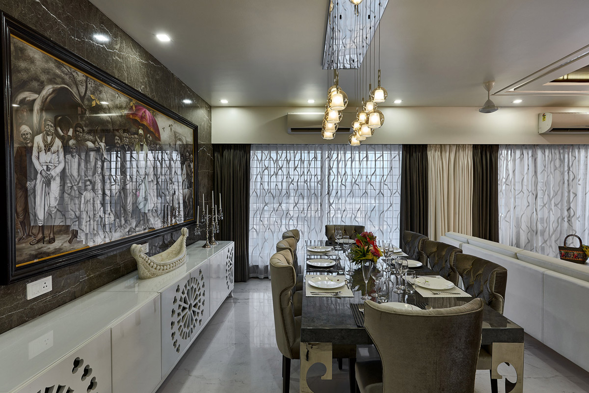 This swanky apartment located in Aundh bears a classy, modern touch. A combination of grey and white Italian marble, suede, velvet and rich veneers gives it a luxurious feel. While retaining tradition, the elements use modern techniques of construction such as use of laser cut S.S jaalis and mirror work. The fabrics, wallpapers, furniture and flooring pattern reflect a Moroccan style and the blown glass light fixtures enhance the beauty of this residence.