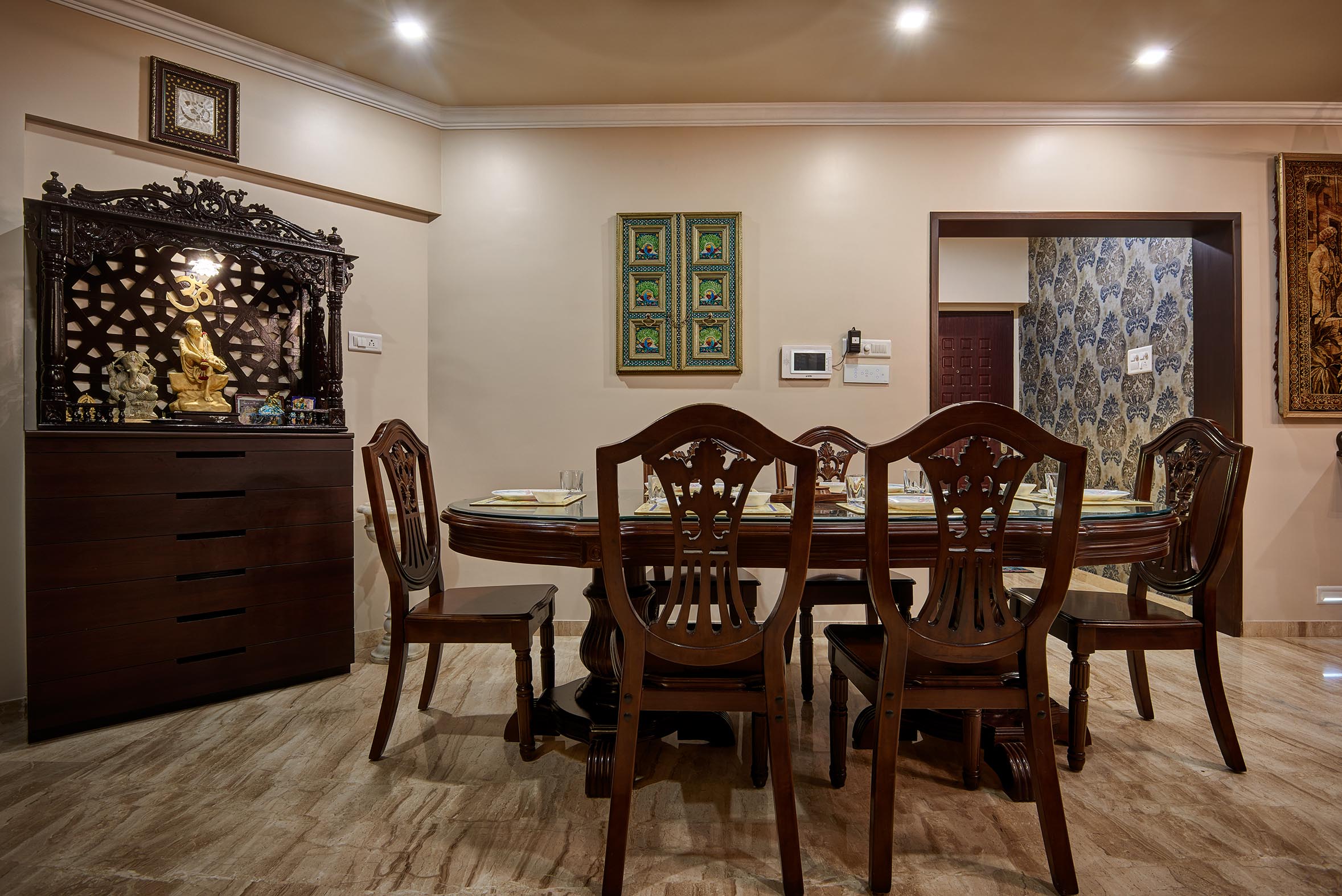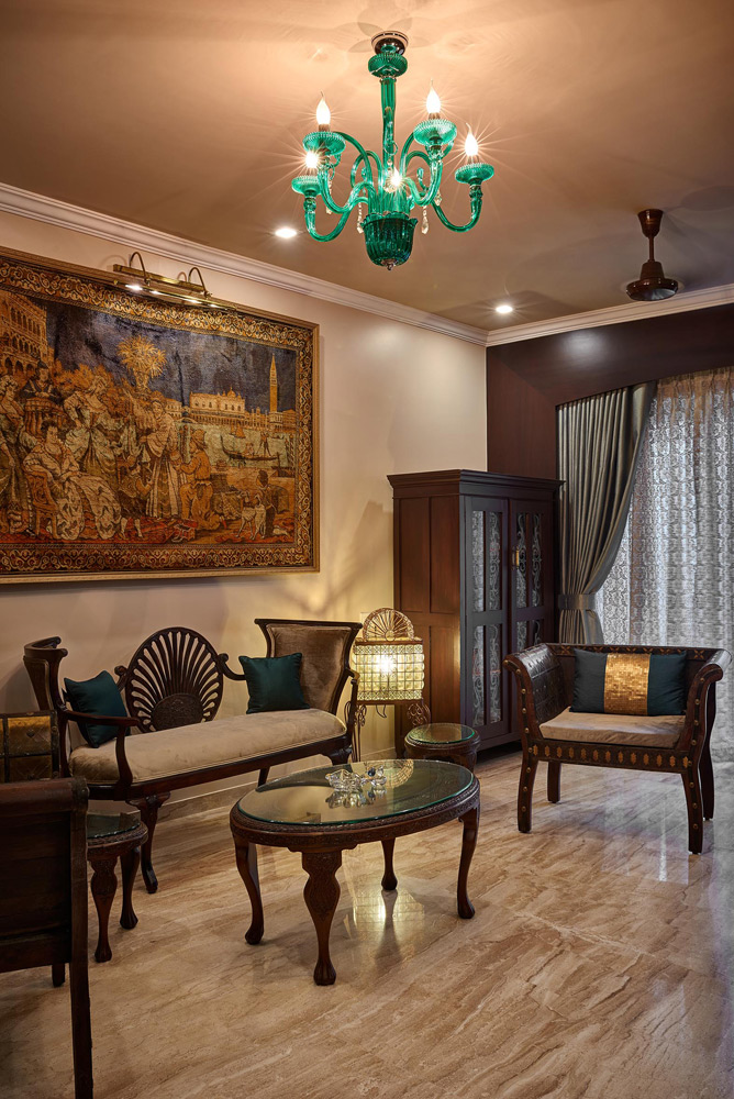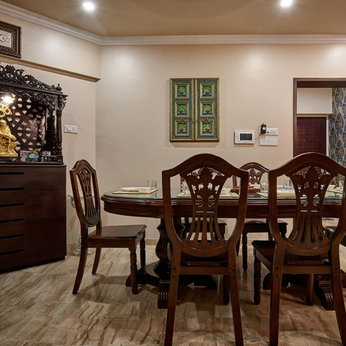 This apartment located in Baner has elegantly carved dark wood furniture, moldings, motif and floral wallpapers which speak of formal Victorian finishes and mark dramatic impressions! The lamp shades and cut glass work chandeliers provide beautiful lighting effects while a fawn color gives a subtle tone to the interiors.