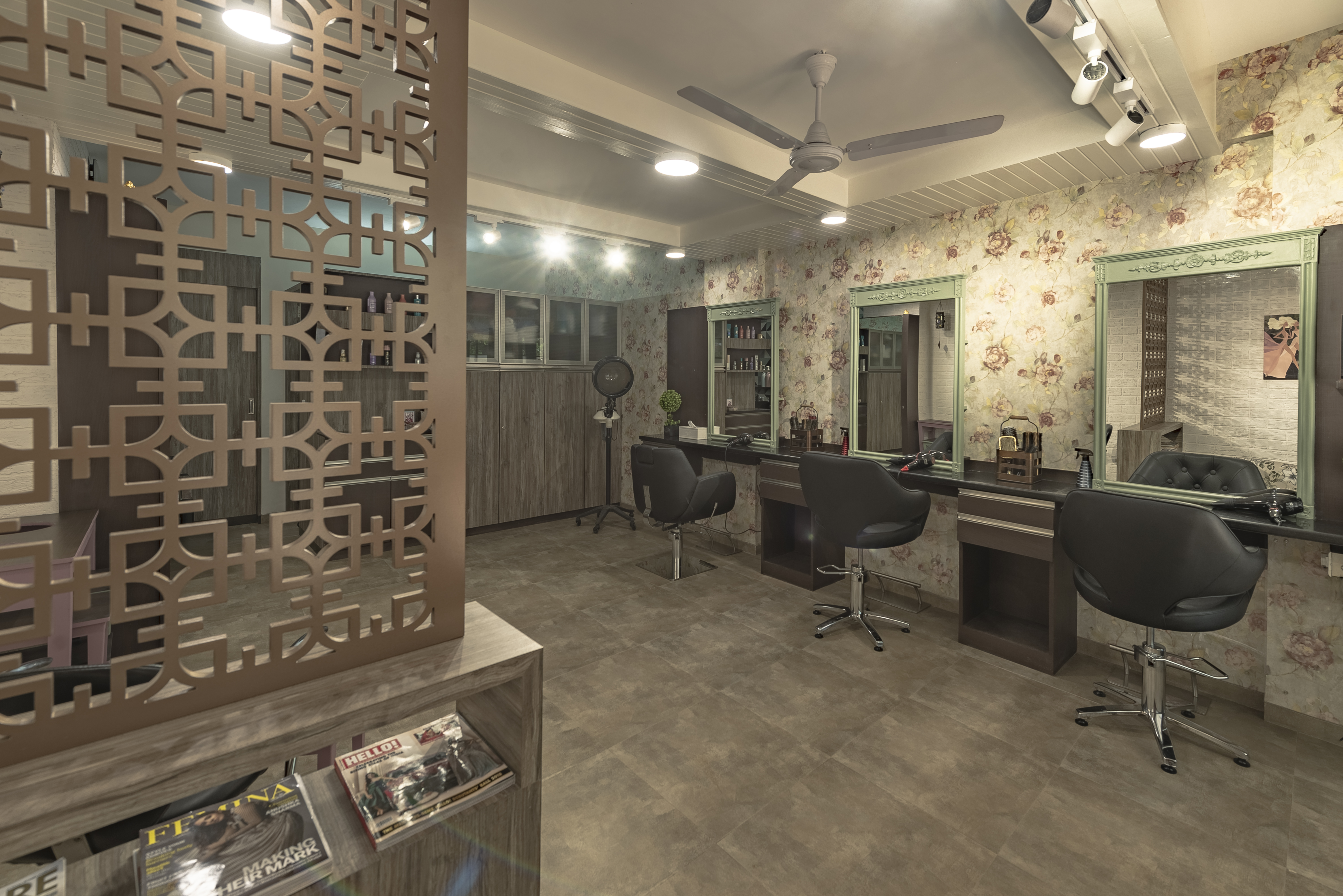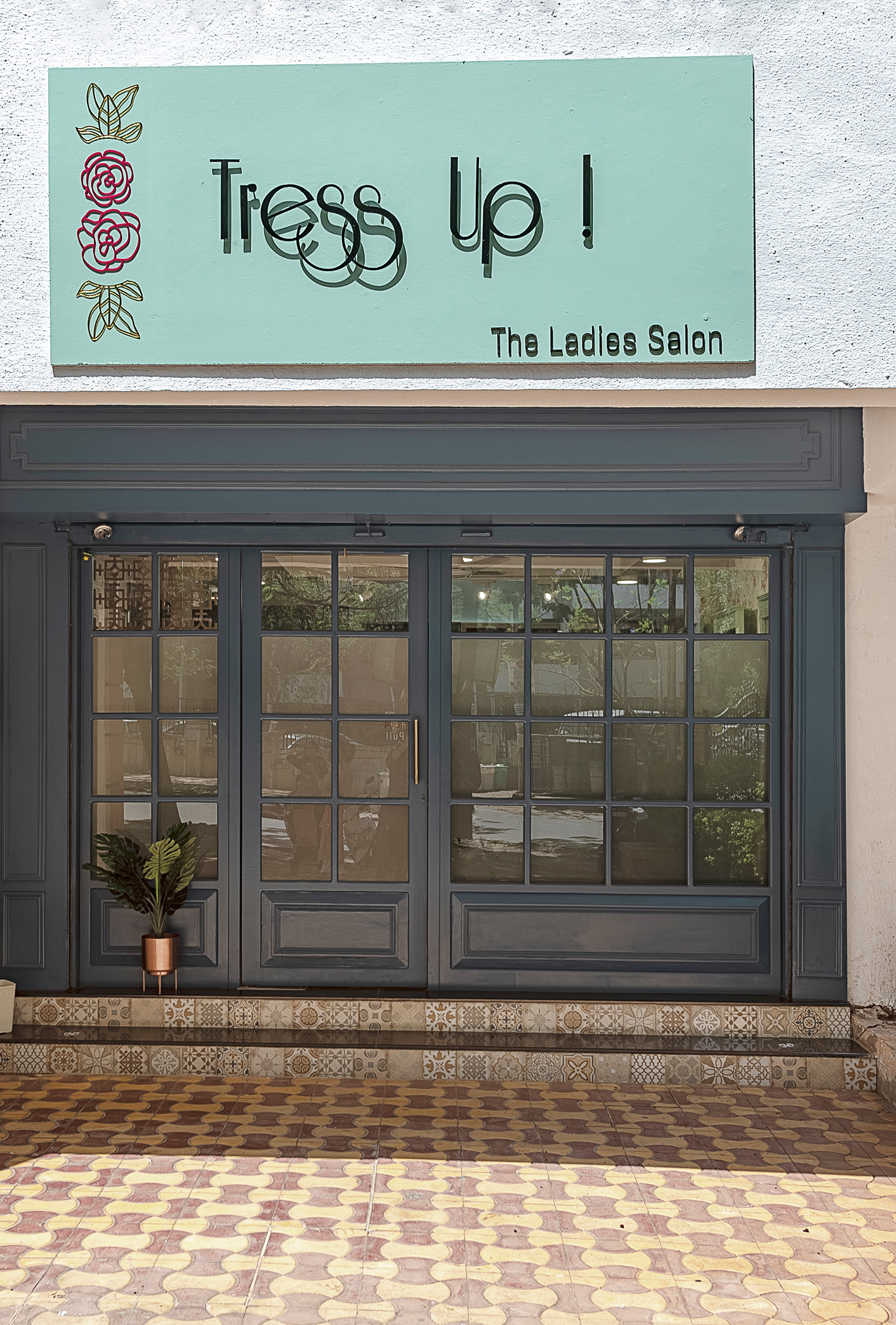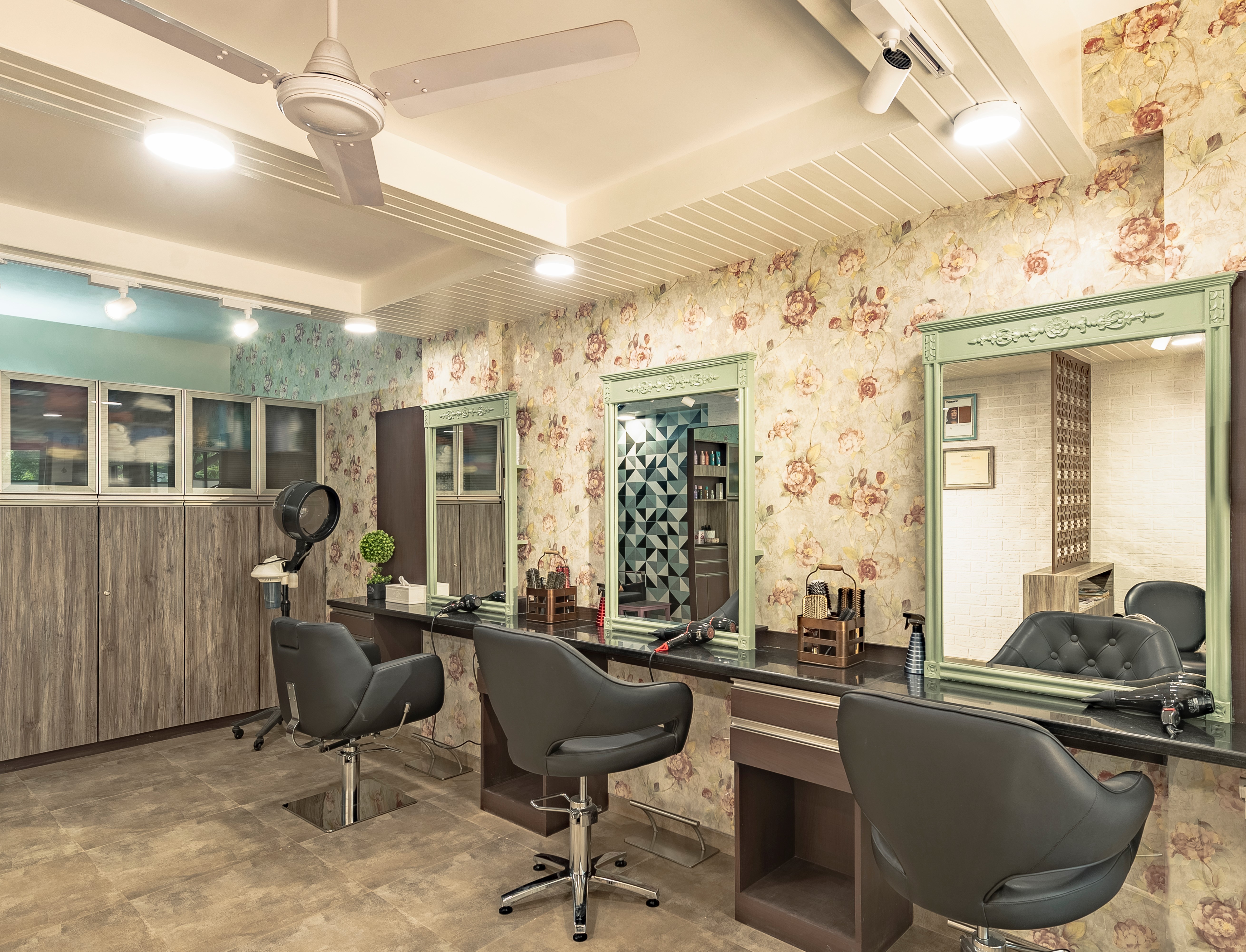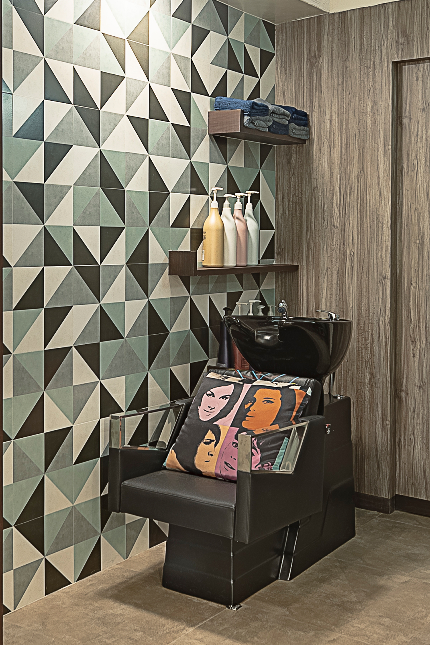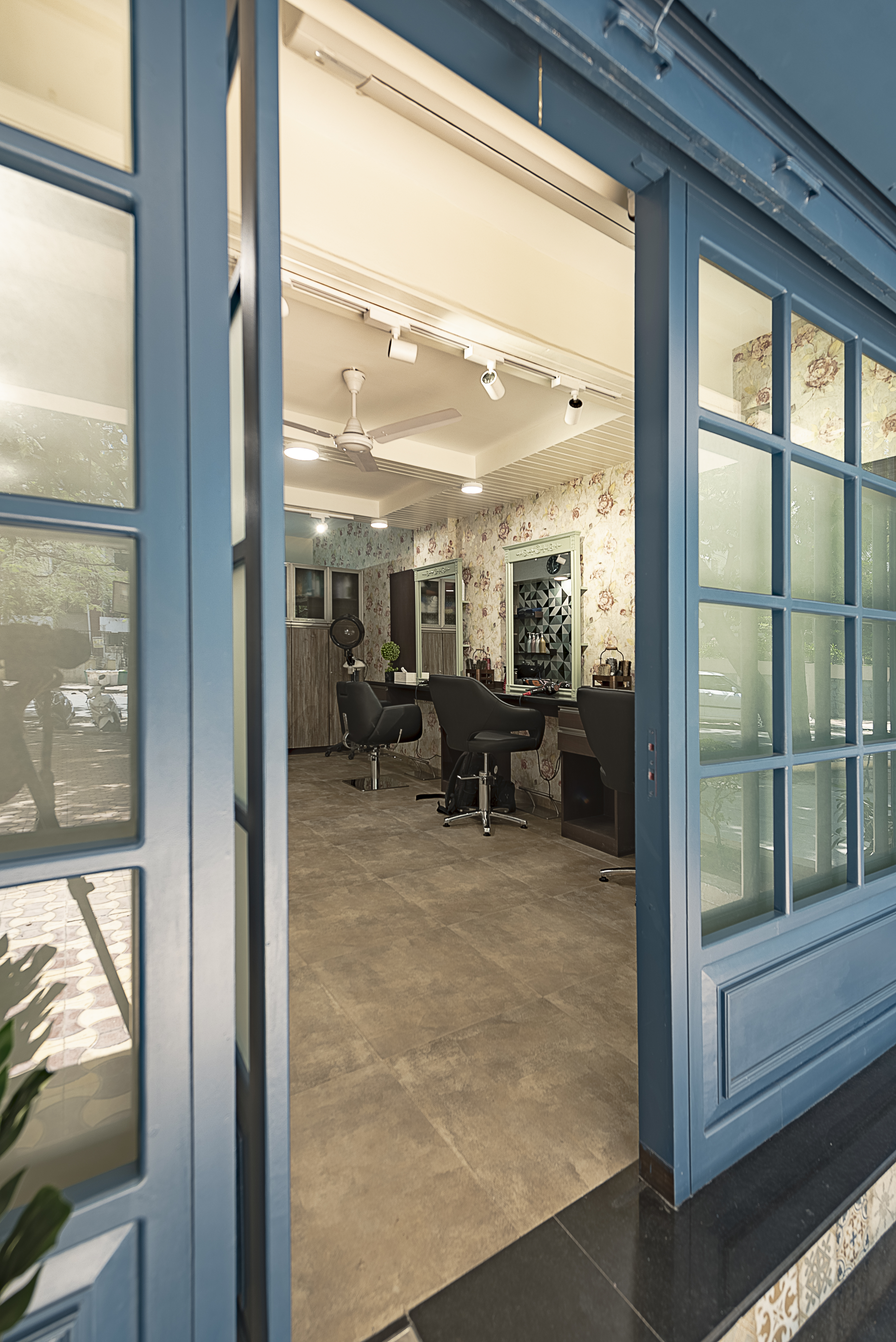 A hair salon designed using vintage French references turned out to be a pretty, fun and feminine space. Juxtaposing the floral wallpaper with a geometric, tiled feature wall gives the space character and depth. The entrance façade in a deep, midnight blue is reminiscent of a façade on a European street.