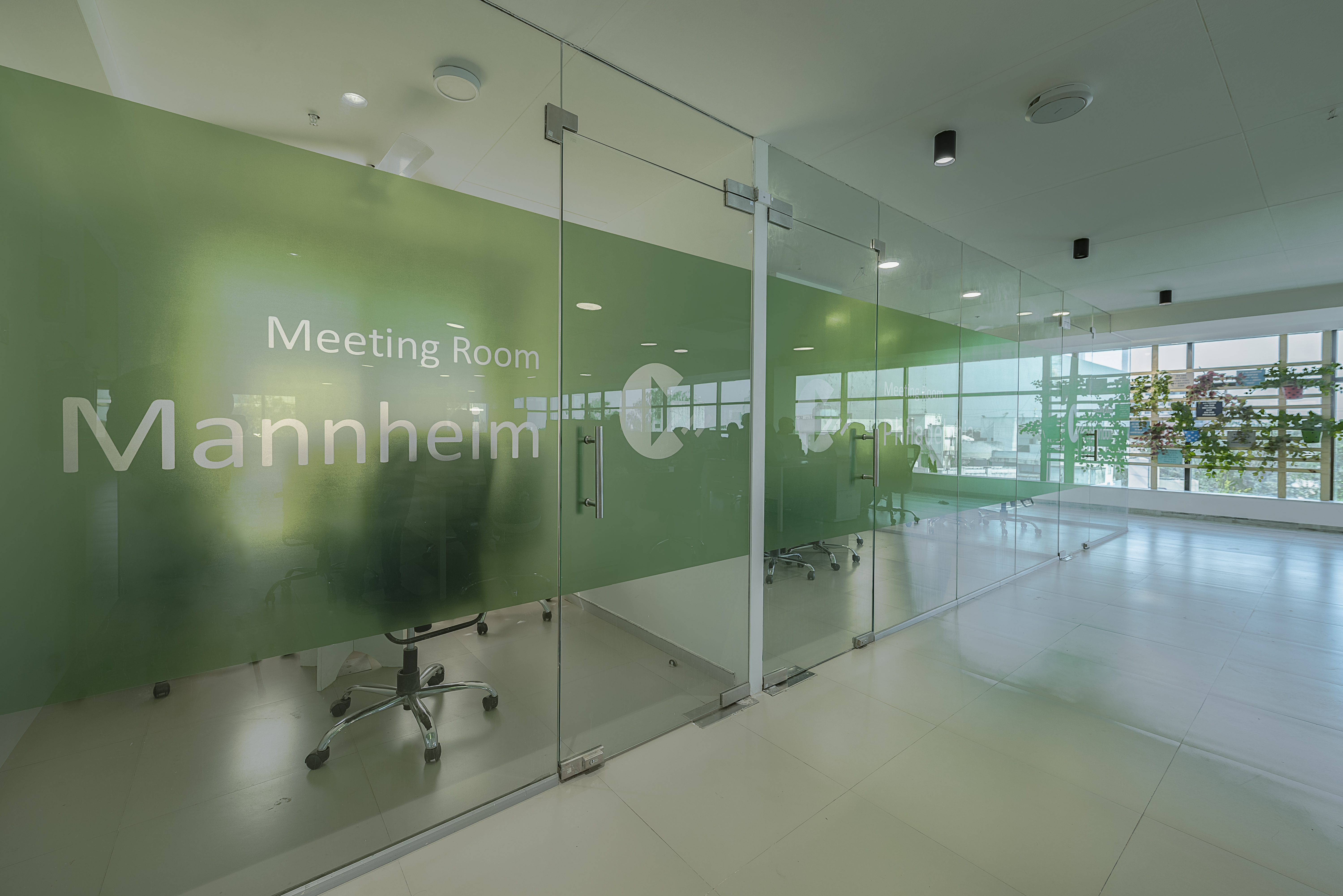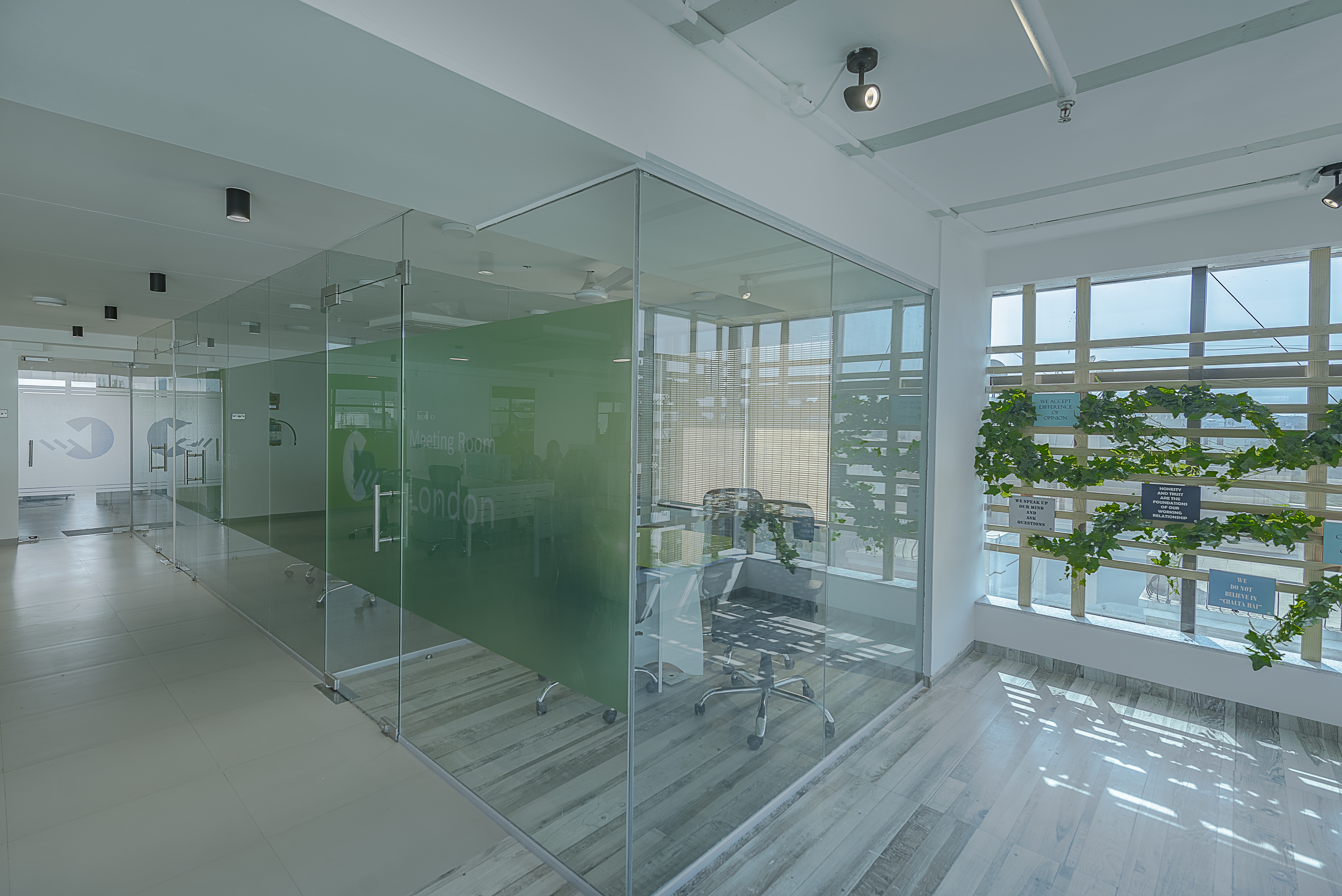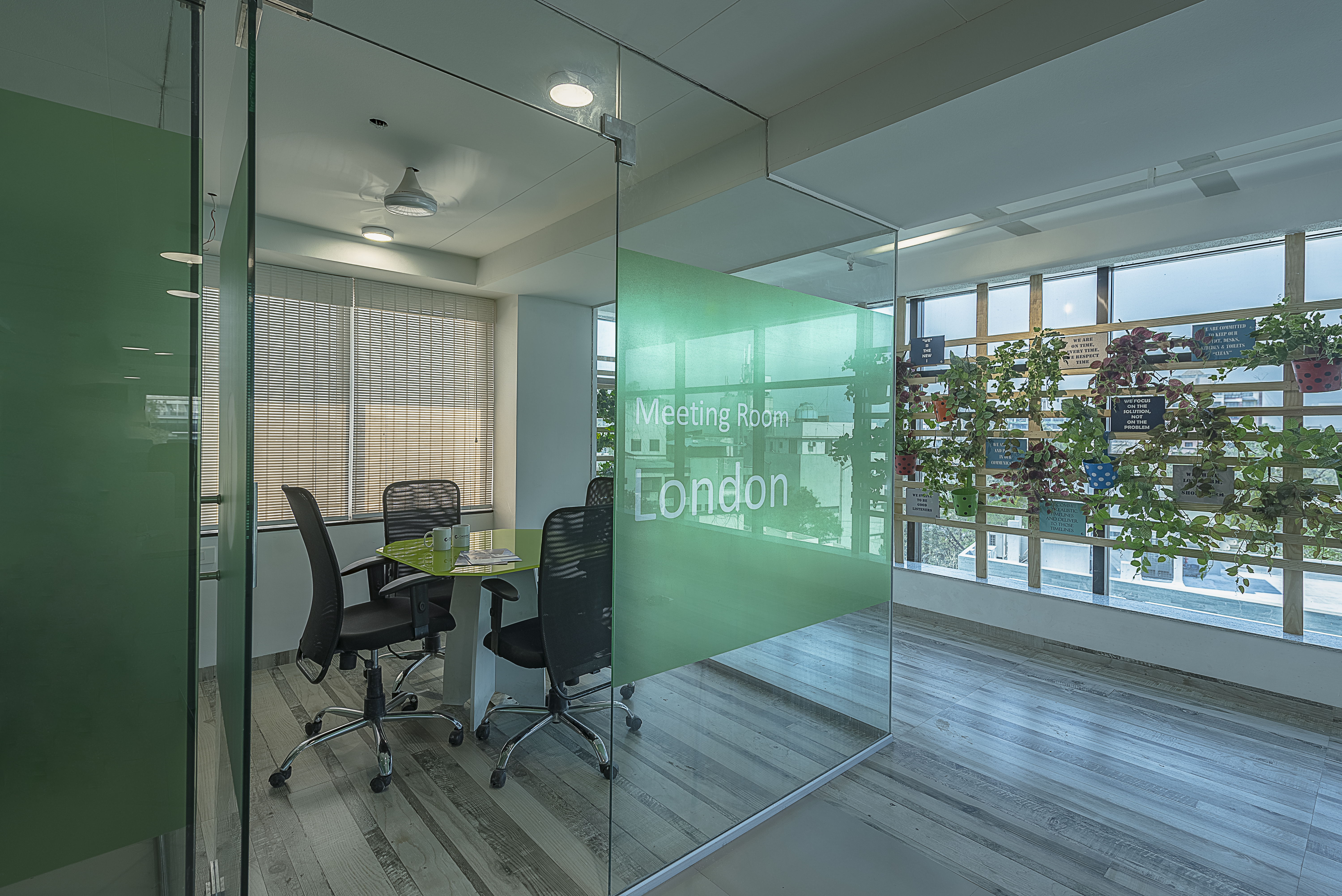 splash of blues and greens made this space interesting along with staying true to its corporate