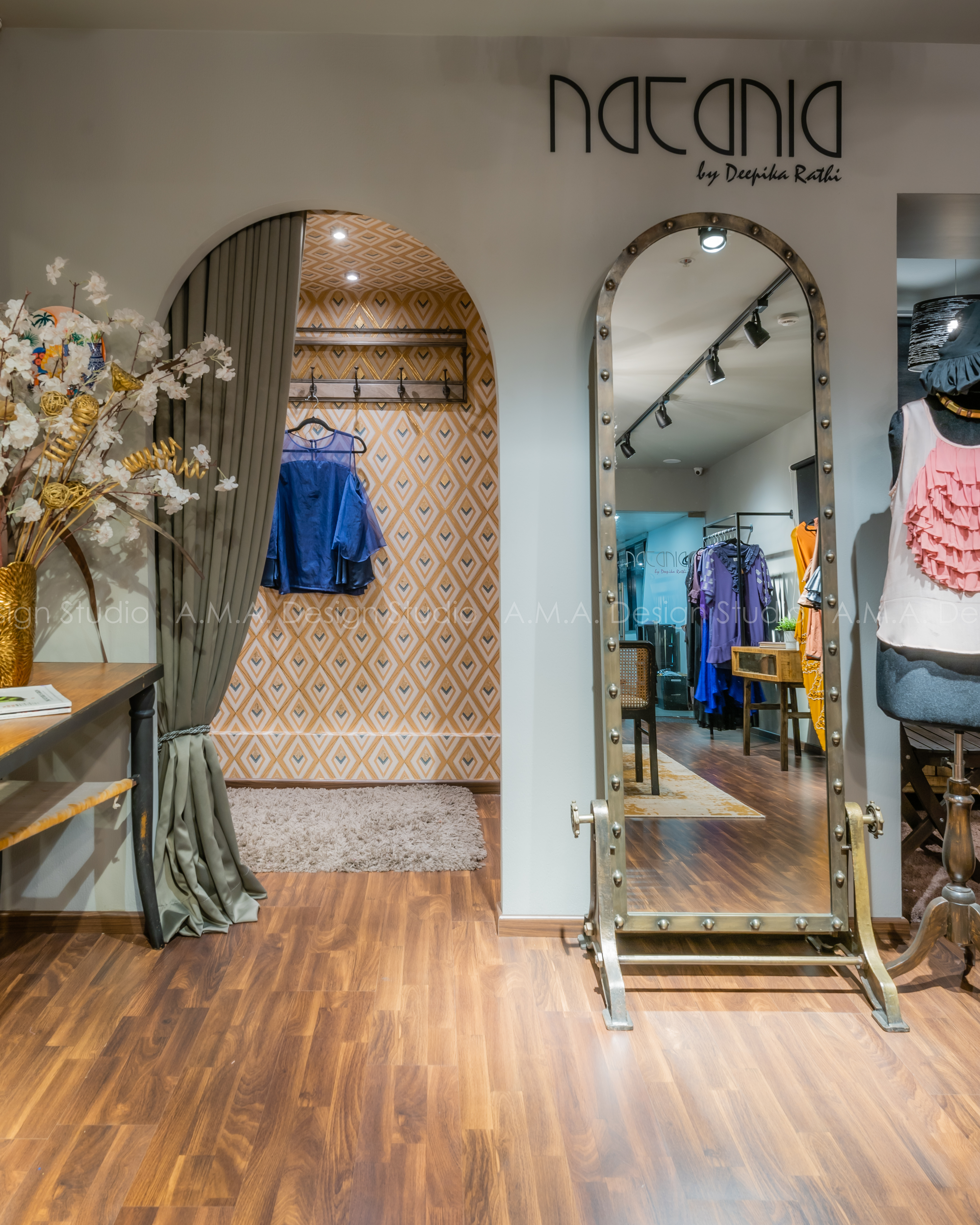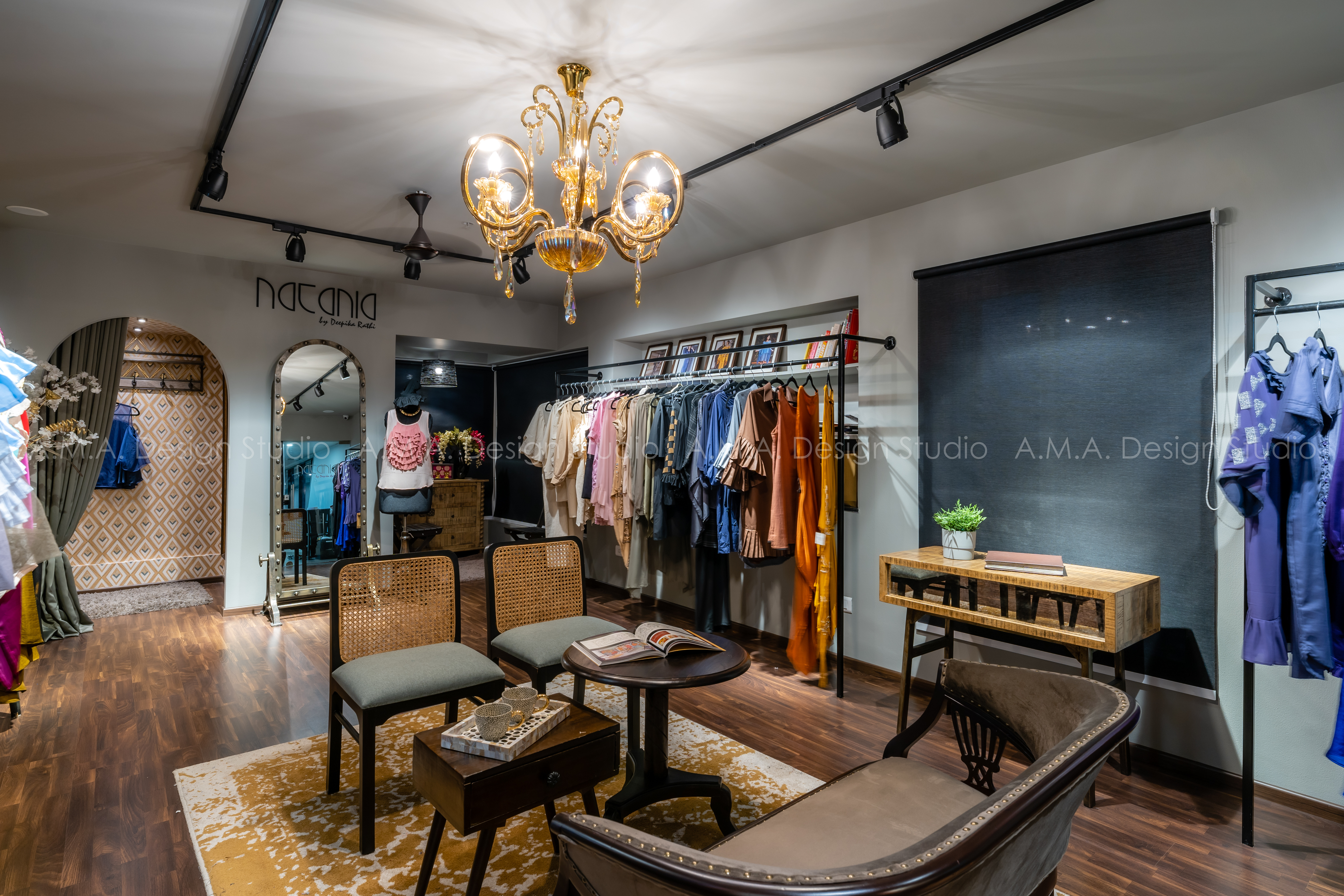 Natania by Deepika Rathi is a 750 sq.ft. boutique studio located in Aundh, Pune, completed in 2021. Drawing inspiration from New York City's iconic lofts, the studio fuses eclectic, vintage, and industrial elements to create a chic, edgy atmosphere. The design features gunmetal accents, dark earthy tones, wooden flooring, and eclectic furniture, reflecting the client's affinity for urban elegance. To address the challenge of low ceilings, the AMA design team employed a clever strategy by painting the walls and ceilings in the same color, creating the illusion of uninterrupted space and preserving the loft's essence.