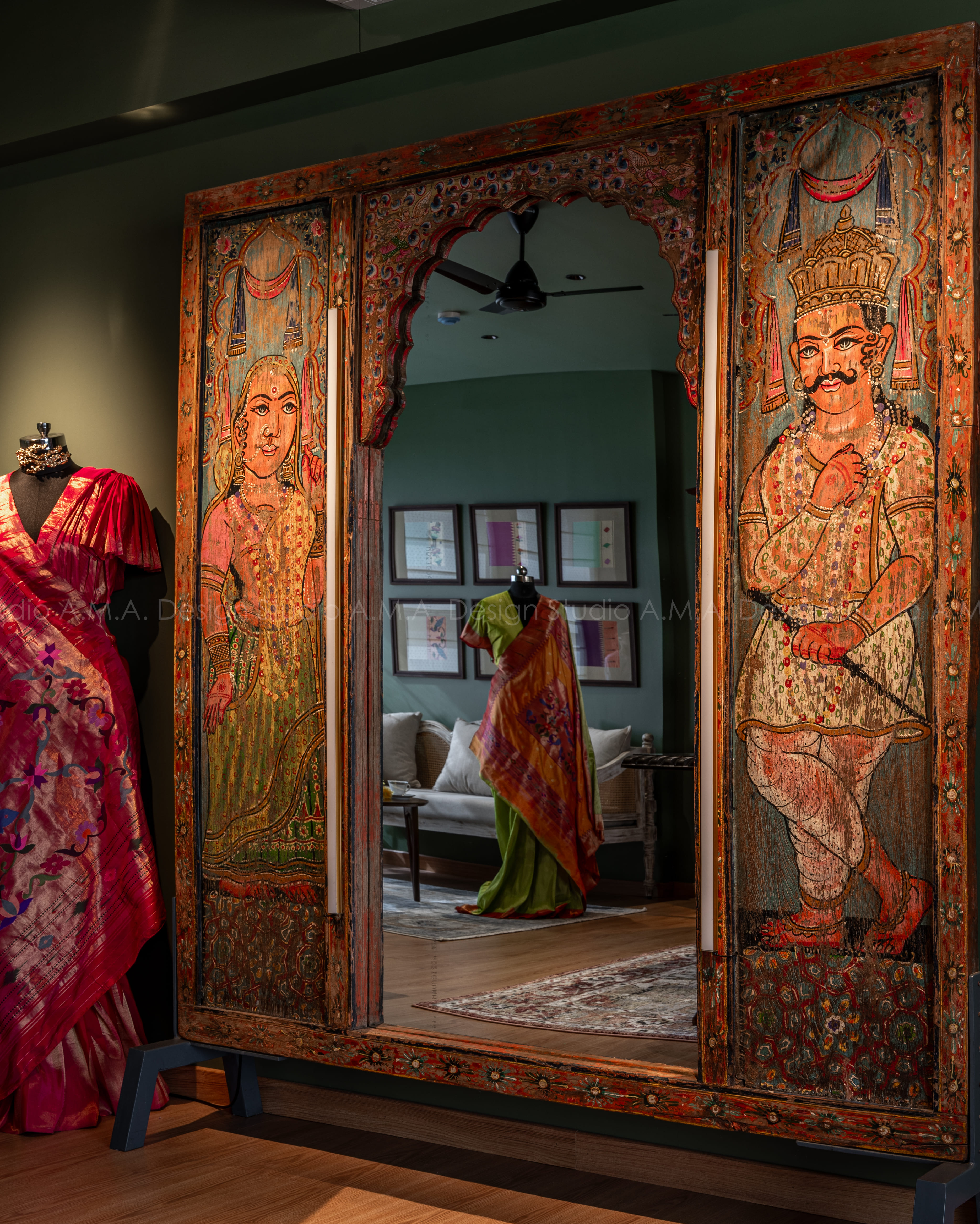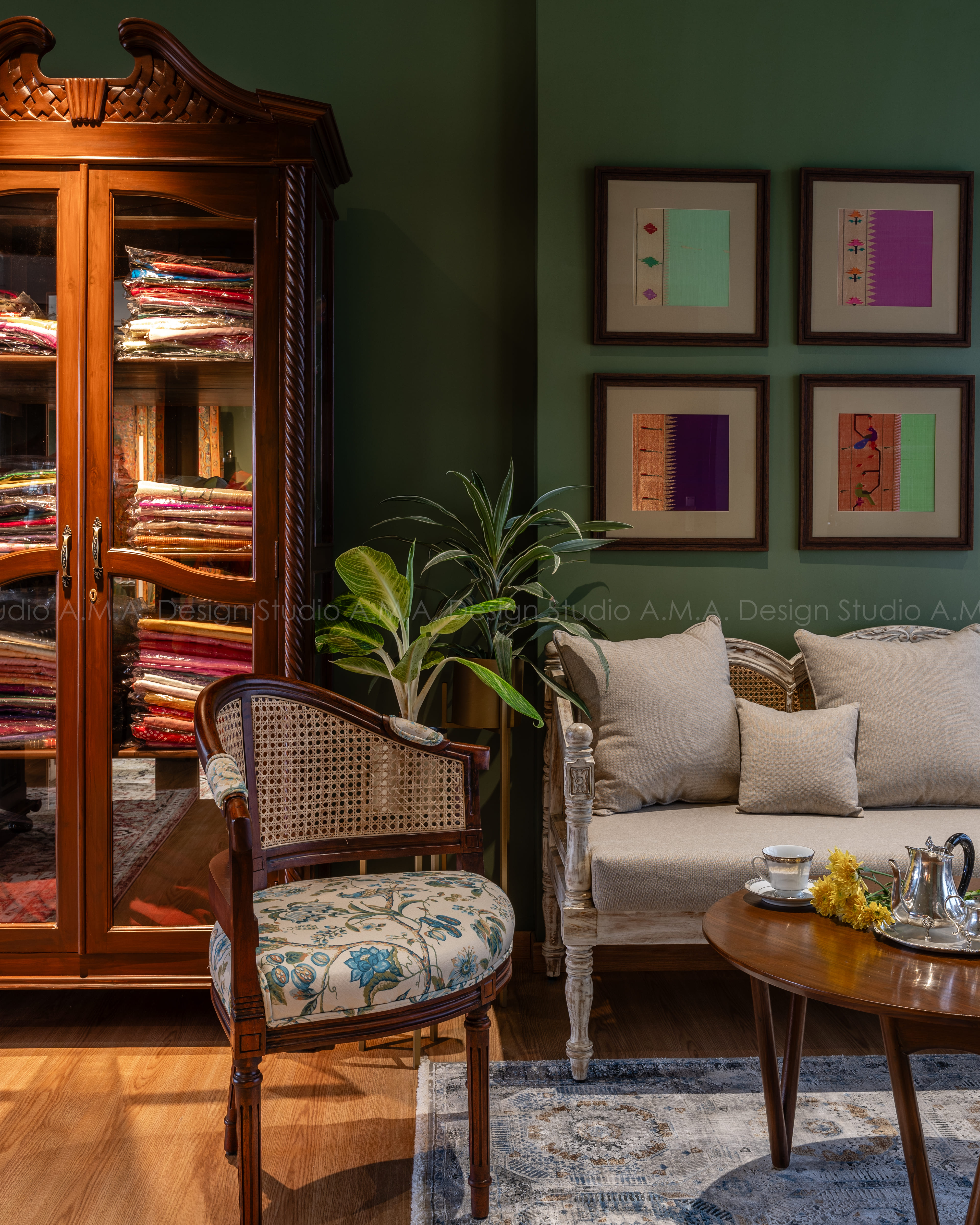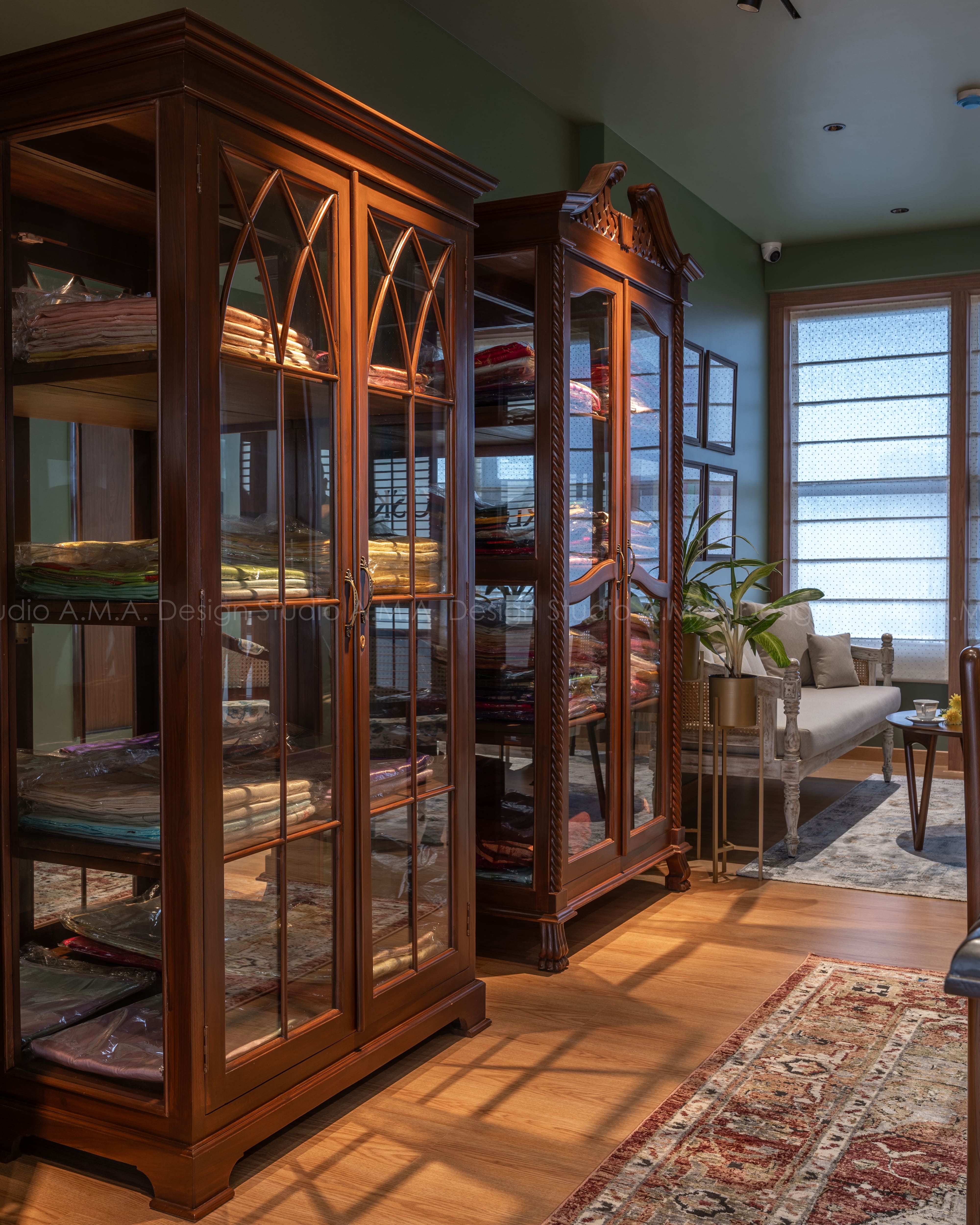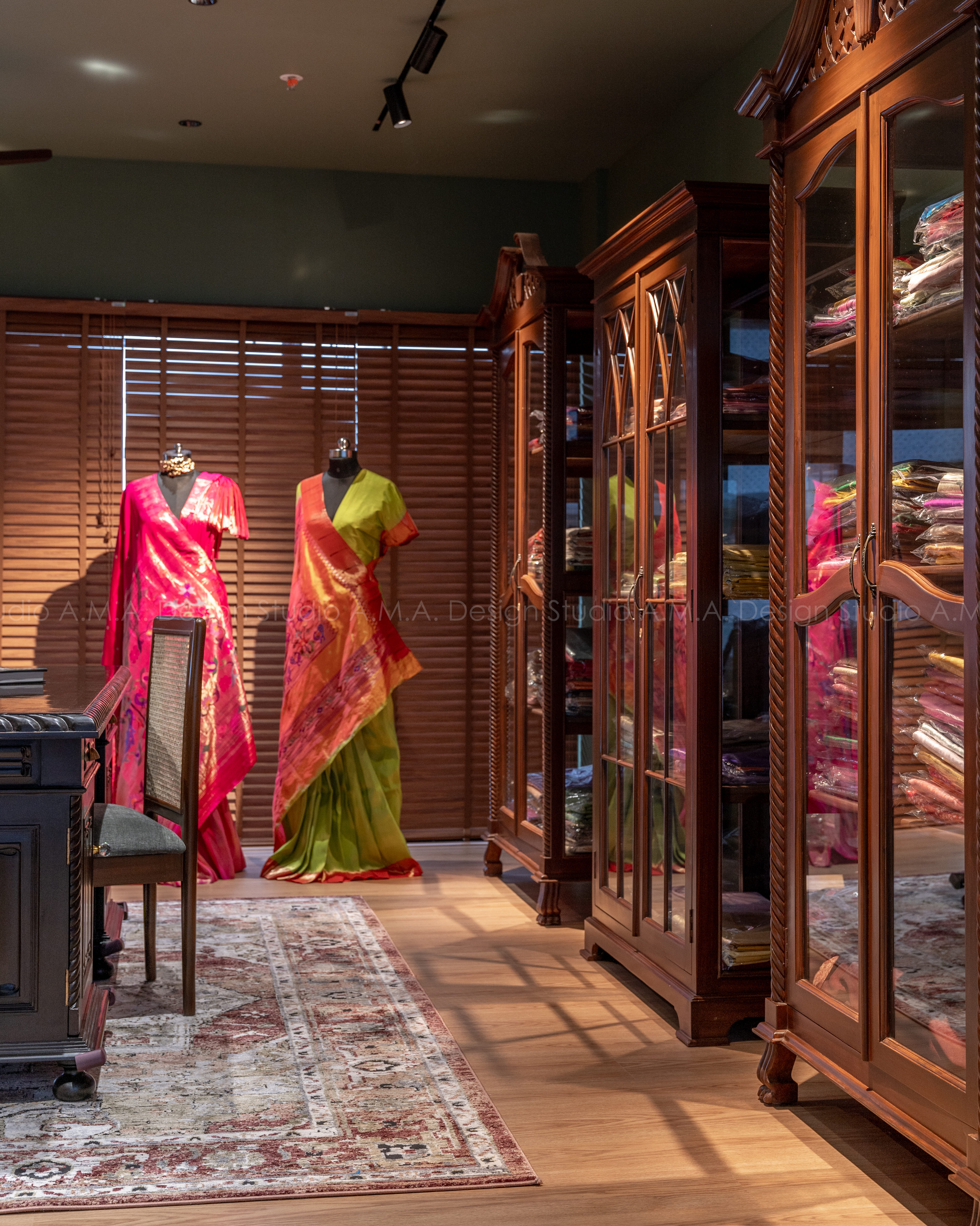 The boutique’s interior is dominated by a rich green palette, a choice made with meticulous care to highlight the inherent beauty of the textiles. This sophisticated hue not only complements the exquisite Pathani sarees but also imbues the space with a soothing and refined ambiance, setting the tone for a serene experience.